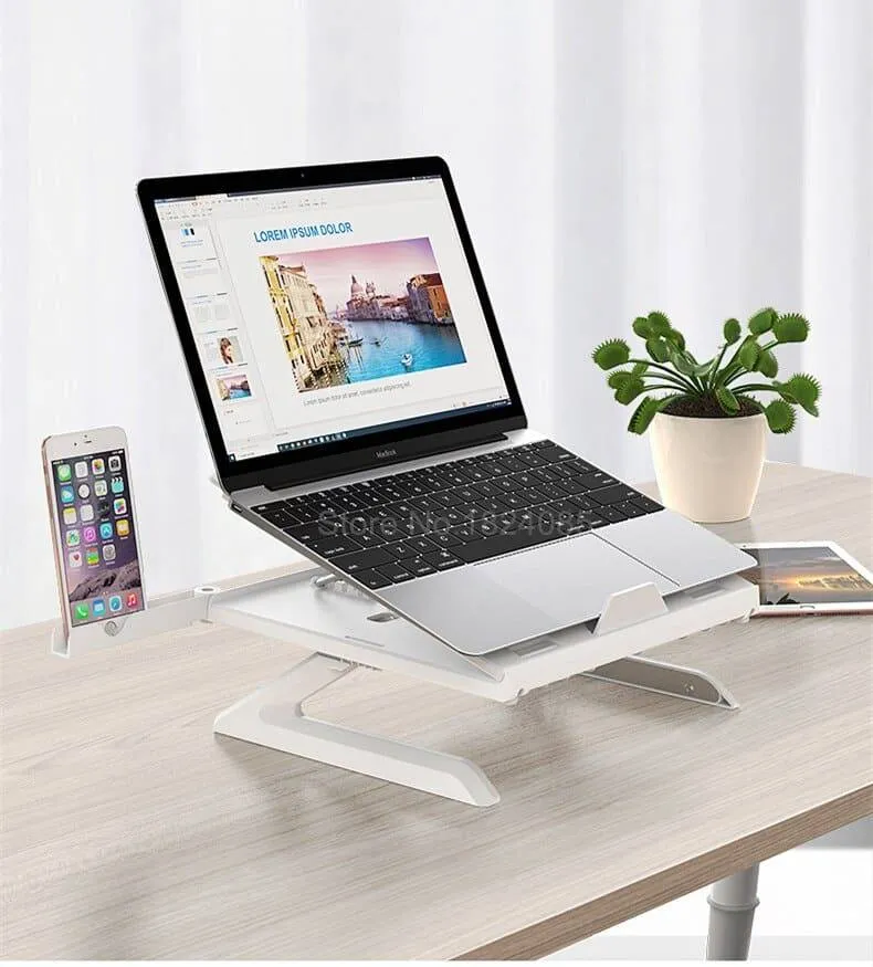 ¡Este soporte portátil para computadora portátil con 2 soportes para teléfono merece 5 estrellas!